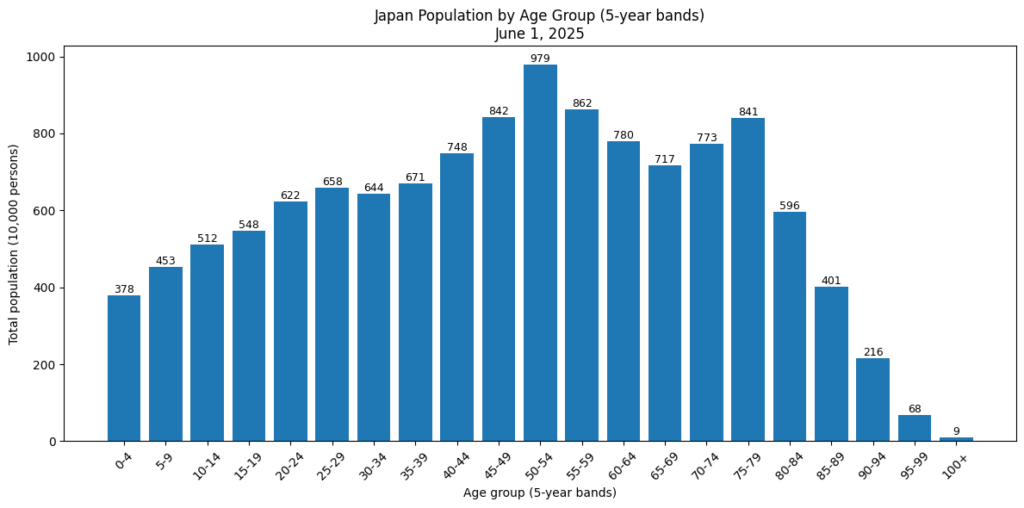 日本の年齢別人口を見ると、特徴ははっきりしている。